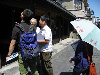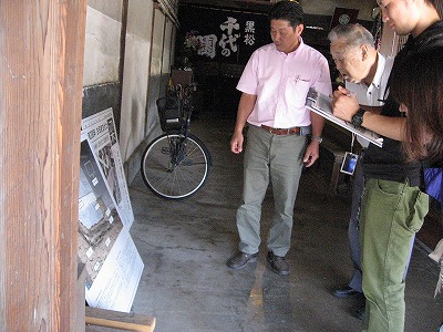 | そしてこのとき自転車で通りかかられた豊前街道の顔「井口さん」と7月以来話をすることできて、この時点でお二人から貴重な話を引き出すことができました。         下の写真は井口さんと本田さんから豊前街道下町地区の家々の改修にまつわる興味深い話を聞いているところです。濃厚な「オーラル・ヒストリー」を実践することができました。 |
