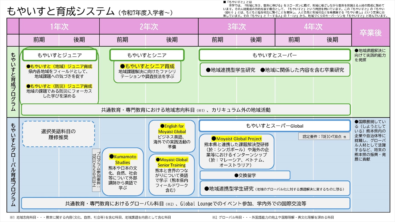 「もやいすと育成プログラム」では、熊本の自然や文化、社会に対する理解に立ち、専門の枠を超えて、自ら課題を認識・発見し、“地域づくりのキーパーソン”として、地域の人々と協働して課題の解決に取り組む人材(もやいすと)の育成を目指します。