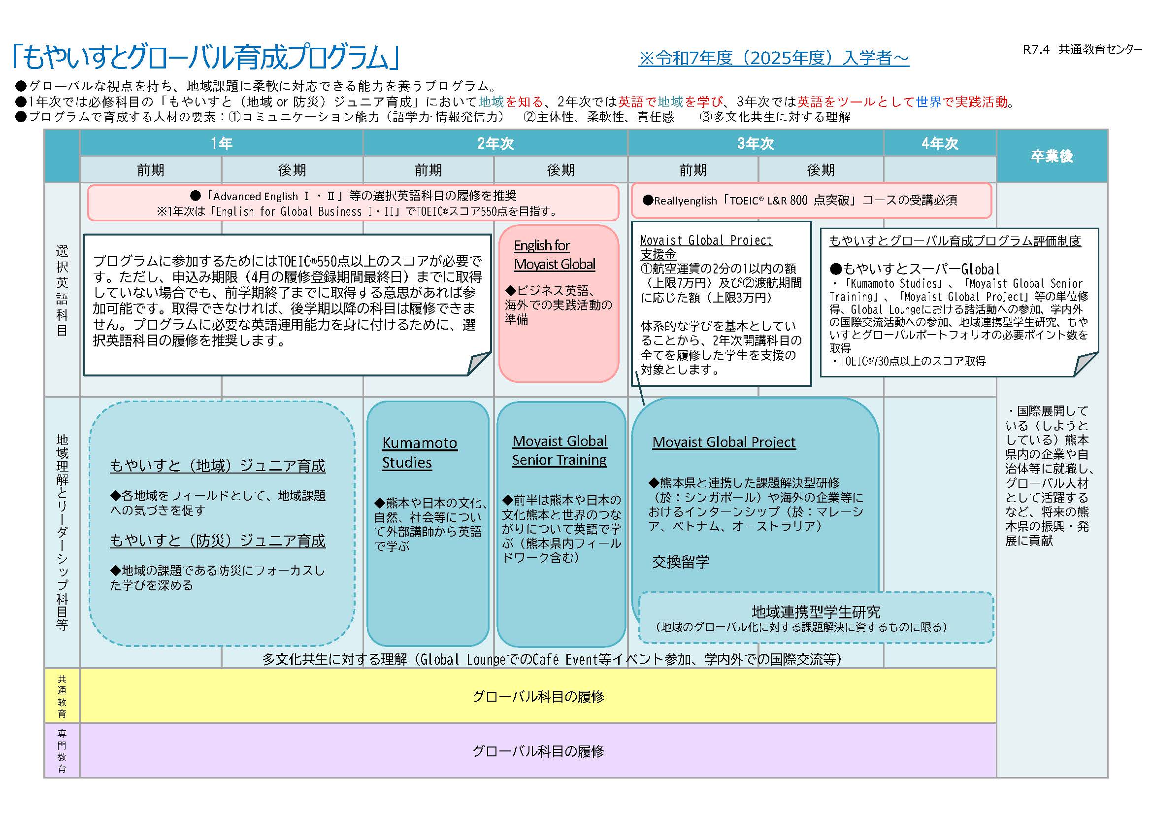 グローバルな視点を持ち、地域課題に柔軟に対応できる能力を養うプログラムです。1年次から4年次までの体系的な学びとグローバルな視点を持つため海外インターンシップ等を促進し、世界でも活躍できる学生を育成します。本プログラムの参加学生には、英語で熊本や日本について学ぶ「Kumamoto Studies」、海外インターンシップや課題解決型研修等を行う「Moyaist Global Project」等の専用科目が用意されており、これらの科目を履修することで、多文化共生に対する理解を深め、英語運用能力の向上を目指すことができます。