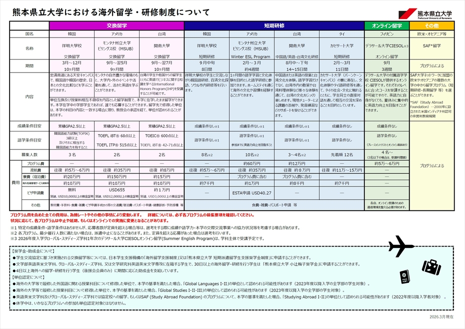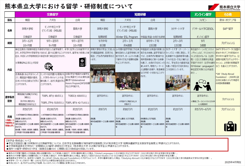 - 募集時期:祥明大學校7月~8月頃、モンタナ州立大学10月~11月頃、開南大學10月~11月頃