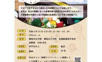2024.09.06.Fri 5CATs 令和6年度熊本県立大学公開講演会「スポーツをするための基本となる食事~エネルギー・栄養素の代謝から考える~」受講生募集 本公開講演会では、スポーツをする高校生とその保護者を対象として、スポーツをするための基本となる食事についてお話します。まずは、自分の体格にあった食事内容の設定の仕方を学び、エネルギーや栄養素の代謝から見た栄養素の必要性に […]