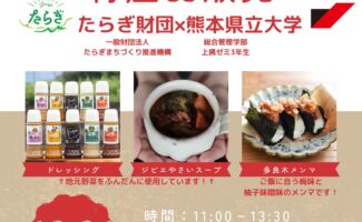 2023.12.15.Fri 3CATs 【総合管理学部 上拂ゼミ】熊本県庁で多良木町の特産品販売を行います 総合管理学部上拂ゼミは、現在、一般財団法人たらぎまちづくり推進機構(たらぎ財団)からの受託事業として「地域在住の学生と協働して多良木町の魅力発掘及び情報発信に関する研究」に取組んでいます。 今回、多良木町の特産品のPR販 […]
