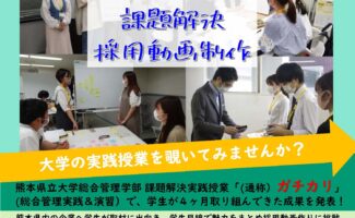 2022.09.01.Thu 総合管理学部の科目「ガチカリ」がTVで放送されます。 熊本県立大学 総合管理学部 産学連携実践科目「基礎総合管理実践&演習(通称:ガチカリ)」は、外部機関と 連携し、実際の課題解決を体験するPBLを教育方法をして、課題解決実践、リーダーシップ教育を行う授業です。 今 […]
