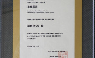 2025.03.04.Tue 12CATs 環境共生学部 居住環境学専攻3年 深野さくらさん_2024年度日本インテリア学会九州支部支部長賞受賞 本学環境共生学部 居住環境学専攻3年 深野さくらさんが、インテリアに関する成績・活動等が特に優秀と認められる者を表彰する「2024年度日本インテリア学会九州支部支部長賞」を受賞しました。