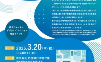 2025.02.27.Thu 3CATs グリーンインフラ普及による「熊本ウォーターポジティブ・アクション」を始動! 公立大学法人 熊本県立大学(理事長:黒田 忠広)、国立大学法人 熊本大学(学長:小川 久雄)、株式会社肥後銀行(頭取:笠原 慶久)、サントリーホールディングス株式会社(代表取締役社長:新浪 剛史)、株式会社日本政策投資 […]
