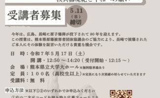 2025.03.13.Thu 5CATs 特別授業公開「被爆者が証言する昭和20年8月9日の長崎」~核兵器廃絶と平和への願い~受講者を募集します 今年は、広島、長崎に原子爆弾が投下されて80年を迎えます。この授業では、熊本県原爆被害者団体協議会のご協力により、長崎で被爆されたご本人にその体験を証言いただきます。貴重な機会となりますので、授業を県民の皆様に公開し、受 […]