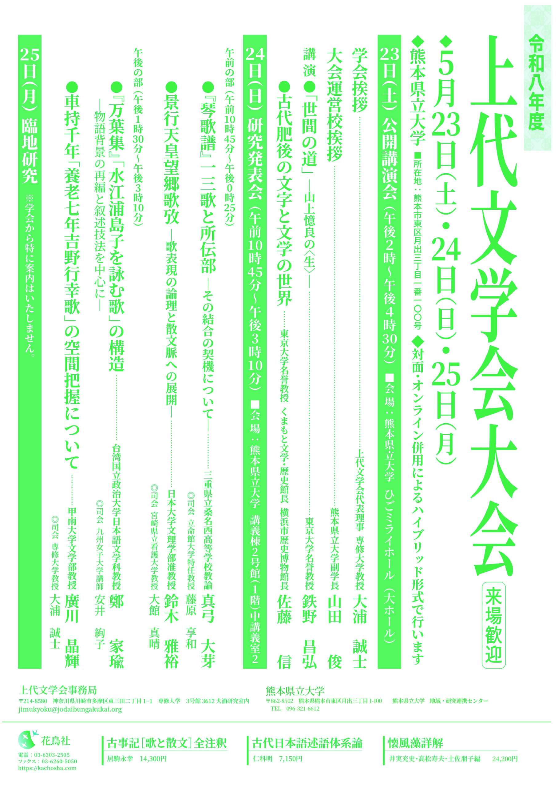 上代日本文学に関する公開講演と研究発表を行います。公開講演会では、佐藤信氏(東京大学名誉教授・くまもと文学歴史館館長)と鉄野昌弘氏(東京大学名誉教授)を招聘し、それぞれ「古代肥後の文字と文学の世界」、「「世間の道」 ―山上憶良の〈生〉―」というテーマで、古代の九州に関する話を専門的な立場からしていただきます。