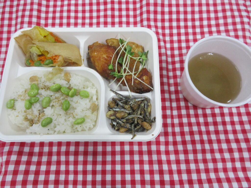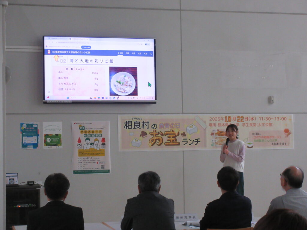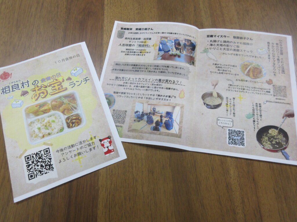 10月の食育の日は、「相良村のお宝ランチ」と題して、人吉球磨地方・相良村で活躍されている方々に教わった“お宝メニュー”を再現したお弁当を提供しました。大豆をはじめとした地域の豊かな食材をふんだんに使い、からだにやさしい知恵と栄養がたっぷり詰まった献立となりました。