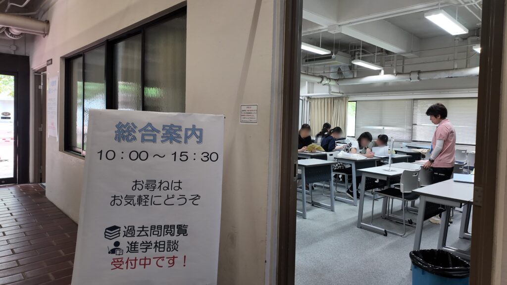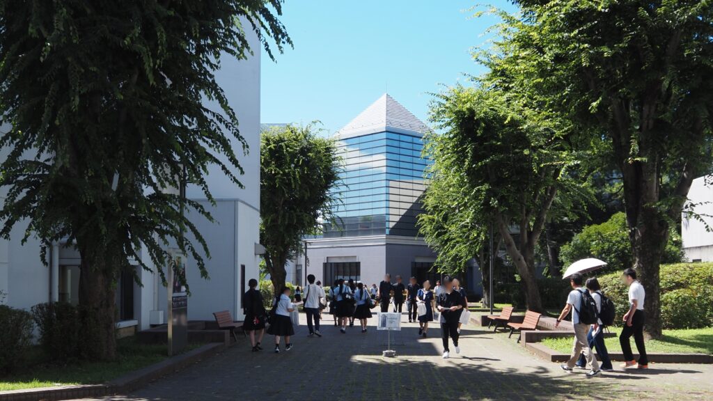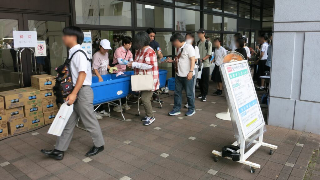 大学に着いたら、参加者は、まずは2か所ある総合受付のどちらかでの受付をしていただき、当日プログラムや大学の案内資料をお受け取りいただきました。また、猛暑の中おいでくださった皆さんに冷たい飲み物もお配りしました。
