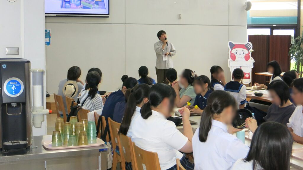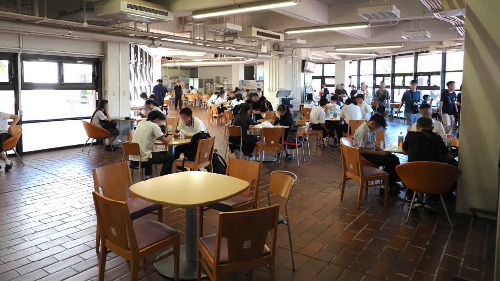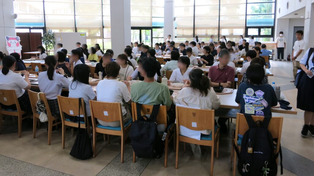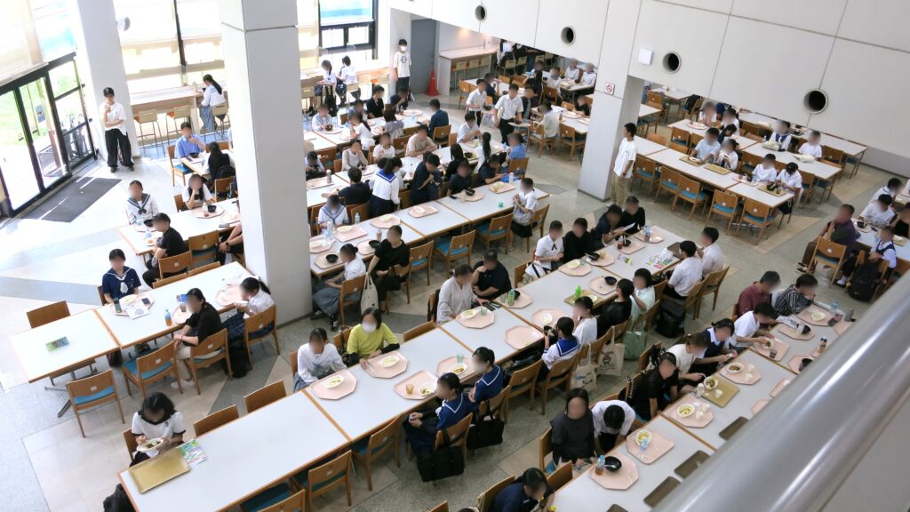 お昼には大学会館1階の学生食堂で、学食を体験していただきました。