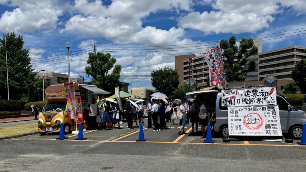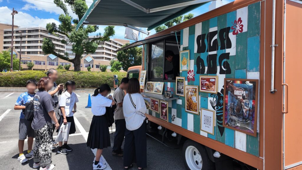 キッチンカーにも来てもらいました。学食体験の食券が早々に売り切れてしまったこともあり、たこ焼きなどの軽食やクレープなどのスイーツ等、キッチンカーのメニューもたくさんの方にご利用いただけたようでした。