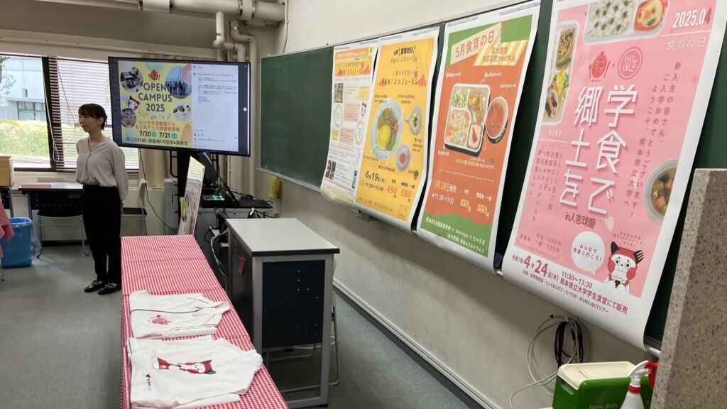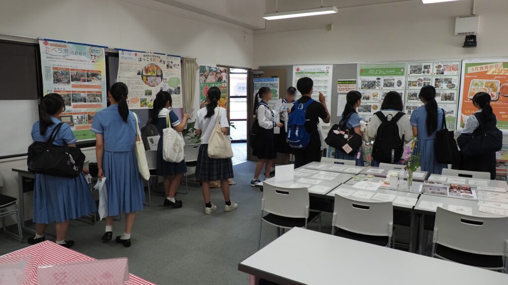 食育活動を行う学生グループ「たべラボ」について、今年は活動紹介ブースを教室に準備し、たべラボキャラクター「もぐ丸くん」のグッズやお土産の配布などを行いました。