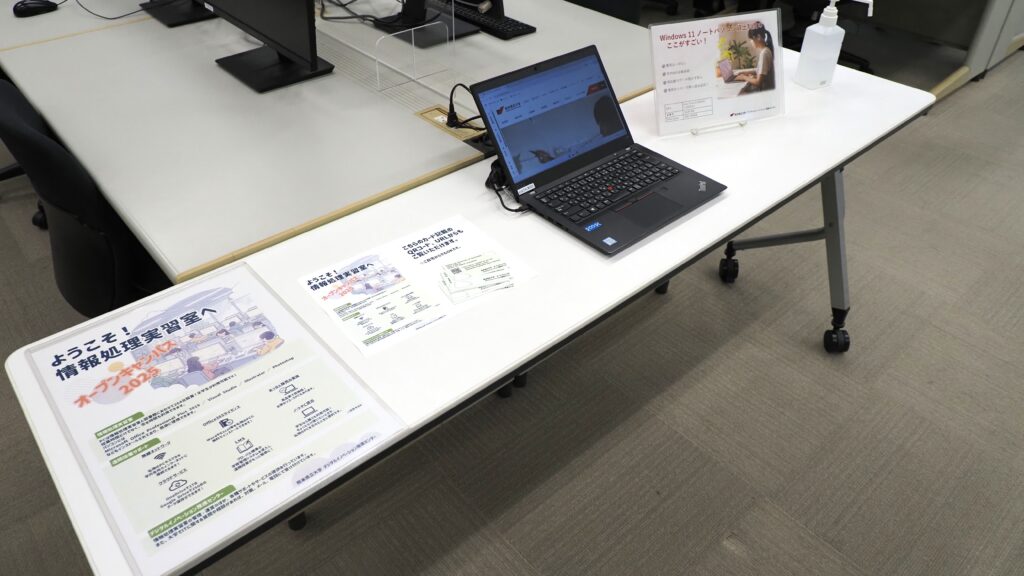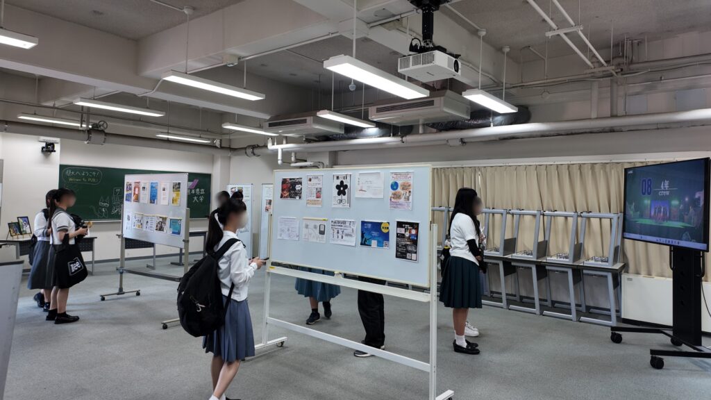 お昼の時間帯には、学食のミニステージで学生自治会によるサークル紹介が開催されました。 また、講義棟1号館の教室にて、サークルのポスターや作品の展示も行っていました。