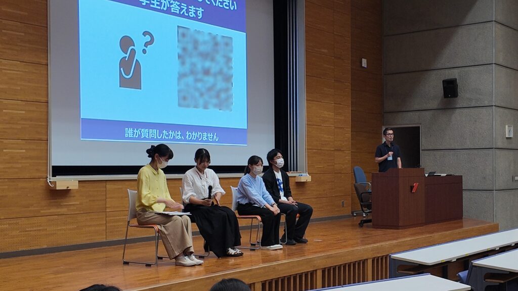 説明会の会場は本学の一番大きな教室である大ホールでしたが、多くの方に参加いただきましたので、教員の説明は、他の3つの講義室でも同時中継して、聴講希望の方全員がご覧いただけるようにしました。どの教室でも熱心にお聞きいただき、とても盛況となりました。