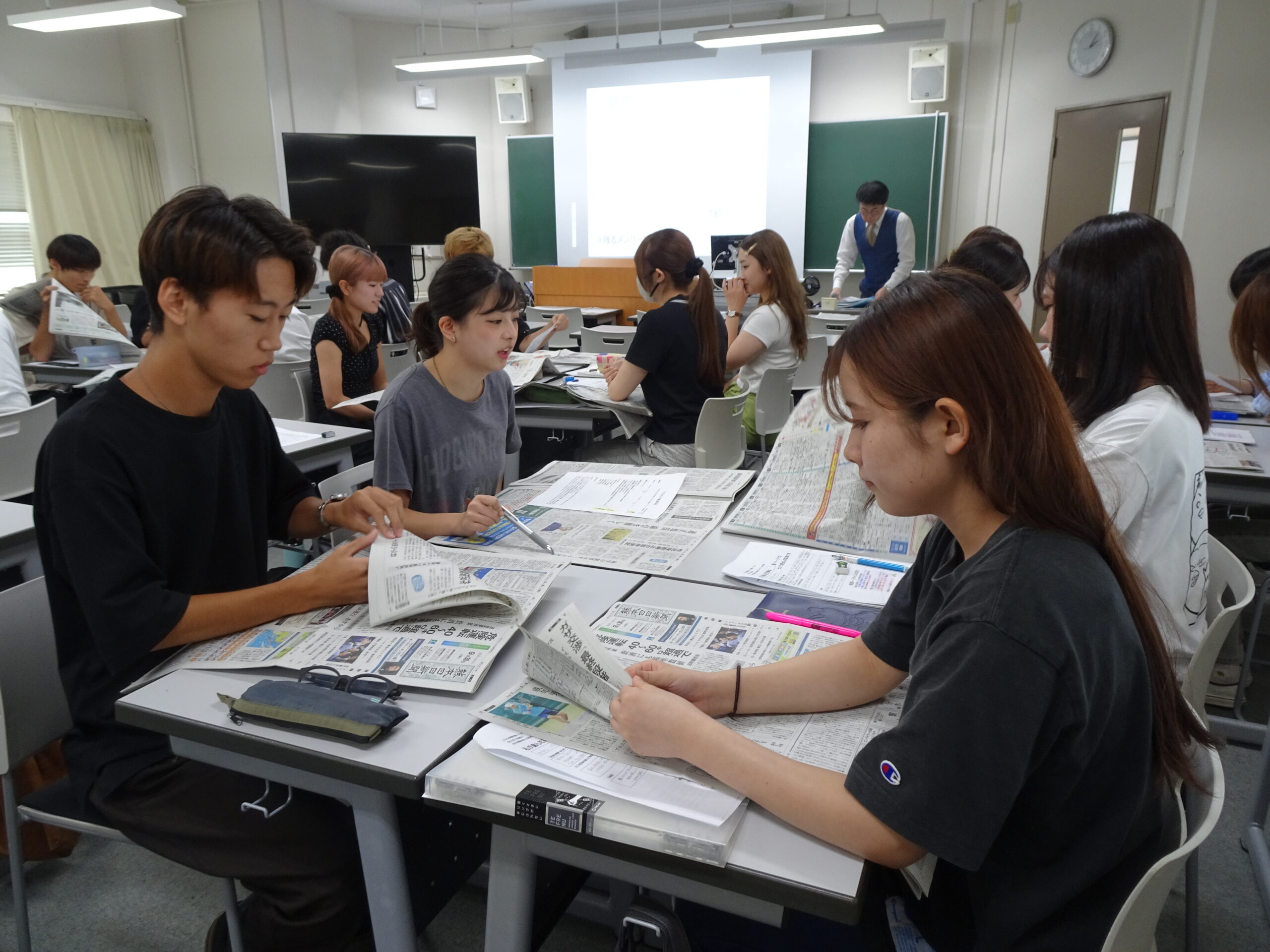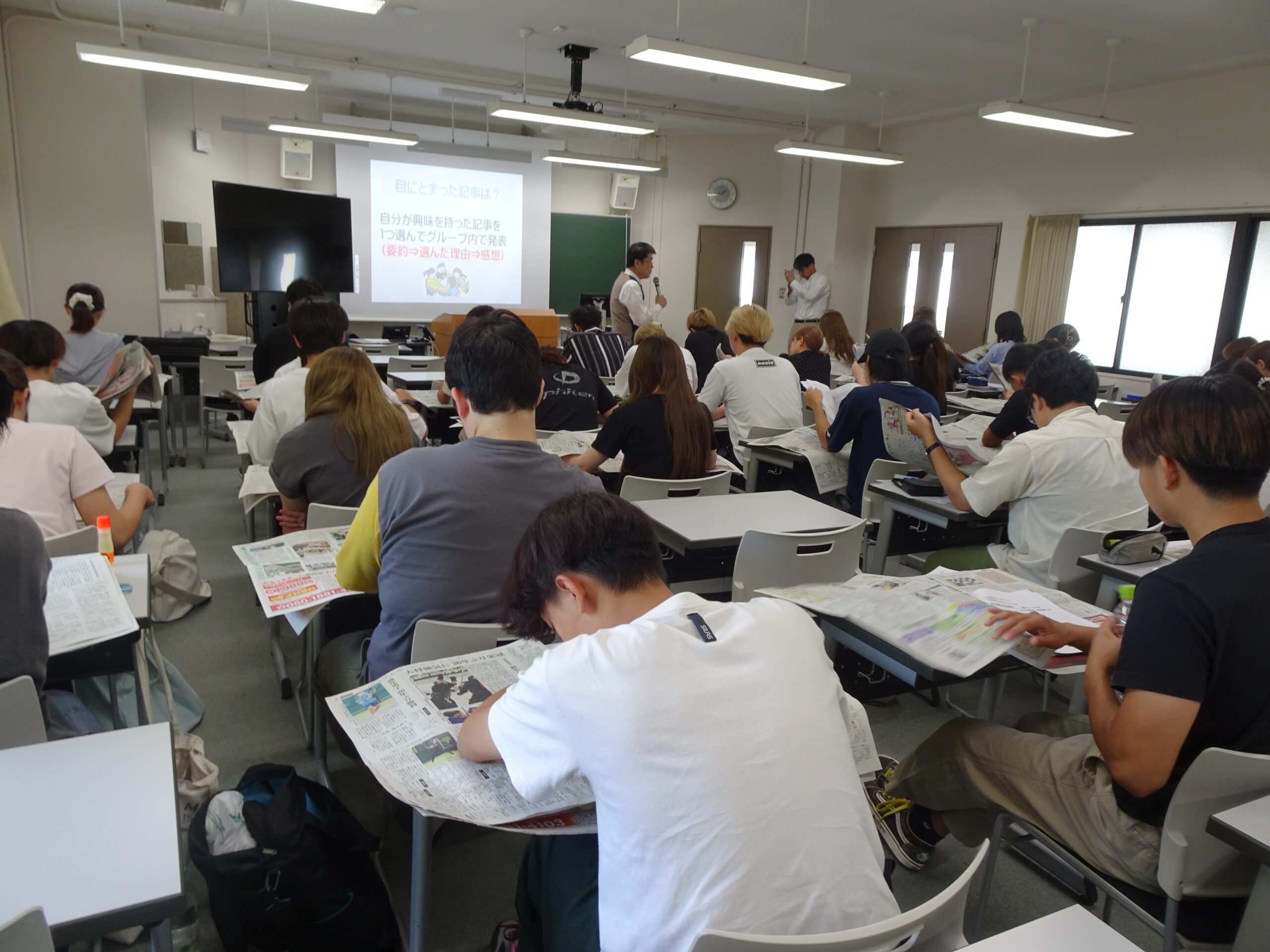 初回授業では、早速学生たちが新聞に目を通し、気になる記事についてグループディスカッションを行いました。普段新聞に触れることは少ないという学生たちですが、初対面同士で活発に意見の交換を行い、活気あふれる授業となりました。