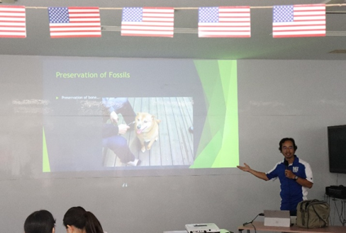 まず国際教育交流センター長のMorrow先生にご挨拶をいただいたあと、山村先生のご専門である恐竜や化石の研究についてお話を伺いました。標本を使う研究の仕方として、薄くスライスしたものを顕微鏡で観察し、何のミネラルが入っているのかを調べる方法が紹介され、化石を研究することで当時の気温や降水量、恐竜が何を食べていたのかを把握することができると説明がありました。アメリカは恐竜の化石が多く見つかることが有名で、モンタナ州の博物館や美術館では世界的にめずらしい恐竜の化石を見たり、発掘作業を体験できるプログラムもあるので、興味がある方はぜひ訪れてほしいと案内されました。