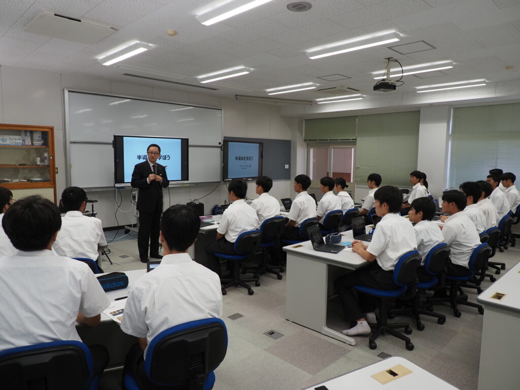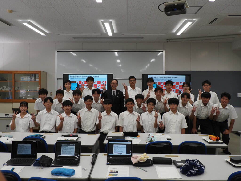 参加したのは、水俣高校半導体情報科1年生を中心とした24名の生徒たち。みんな真剣な表情で話を聞いていました。講演後には、黒田理事長と生徒たちで記念の集合写真を撮影しました。