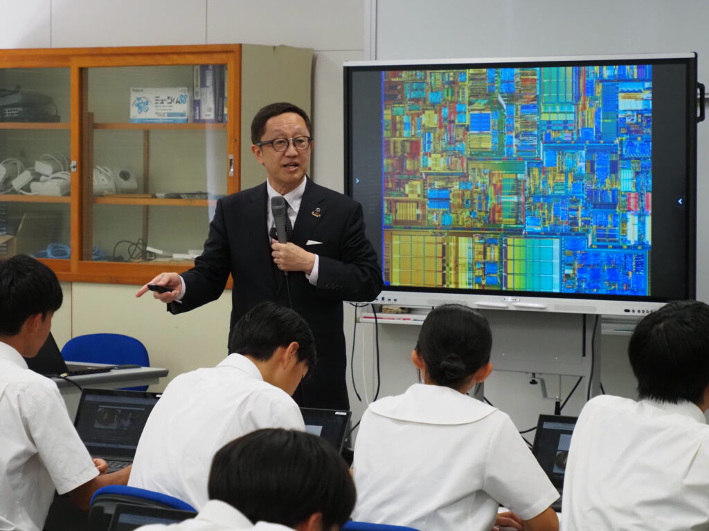 2025年10月14日(火)、熊本県立水俣高等学校にて『半導体を学ぼう』をテーマに黒田理事長が講演を行いました。講演では、スマホやゲーム機、AI(人工知能)など、身近なテクノロジーに欠かせない「半導体チップ」について、どんなふうに作られて、今後どのようになっていくかなどを解説しました。