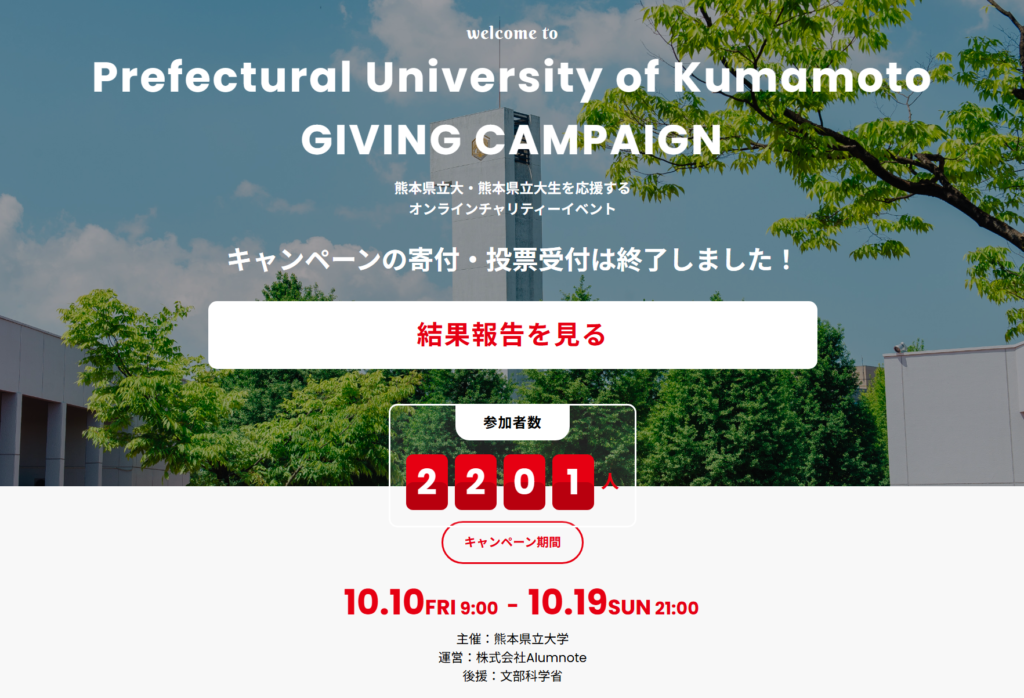 2025年10月10日(金)~19日(日)に開催したオンラインチャリティイベント「Prefectural University of Kumamoto Giving Campaign」では、2千名を超える方に投票していただき、多くのメッセージと貴重な御寄附もいただきました。御協力いただいた皆様に心より御礼申し上げます。