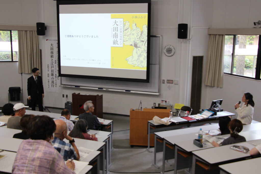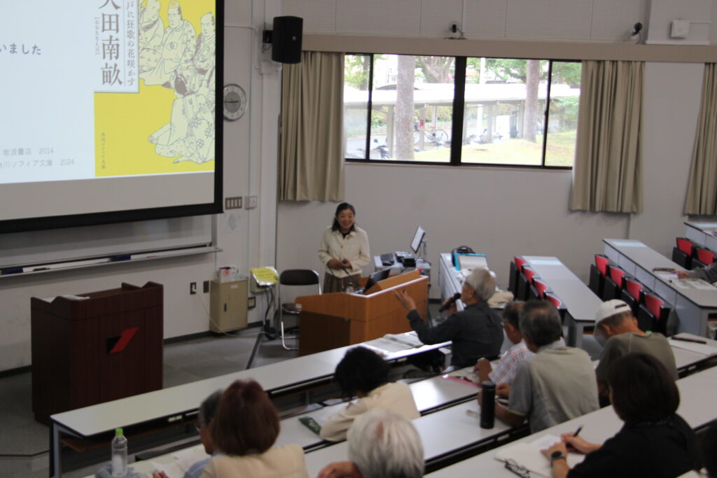 講師は法政大学の小林ふみ子教授。近世文学を専攻され、特に天明狂歌やその主導的立場にあった大田南畝(おおたなんぽ)の研究の第一人者であり、今回も「大田南畝と江戸狂歌の流行」と題してお話しいただきました。