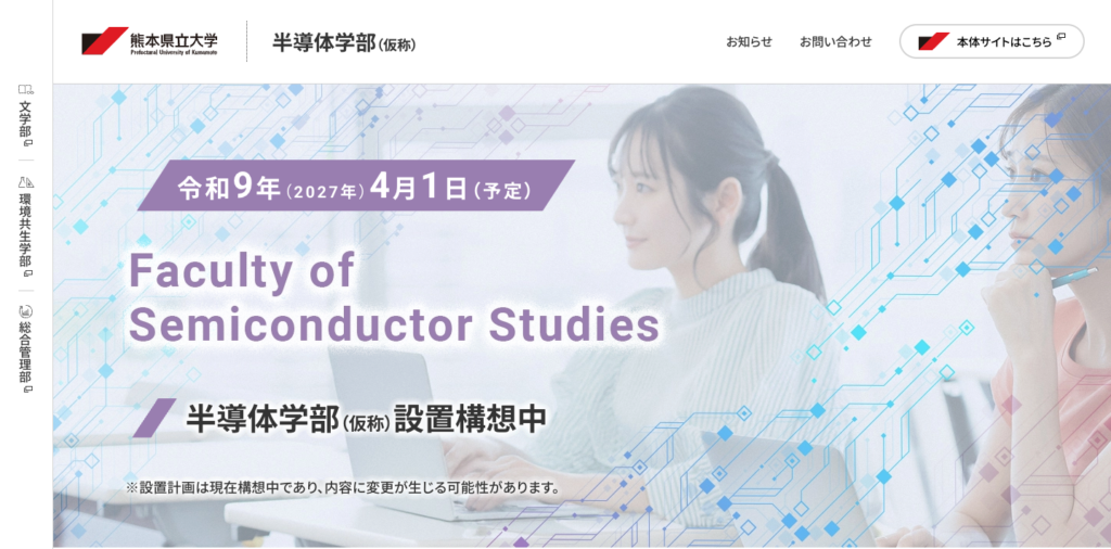 この度、半導体学部(仮称)のホームページを開設いたしました。 学部の紹介や研究活動、最新ニュースなどをこれから発信していきます。ぜひチェックしてみてください! → 半導体学部(仮称)ホームページ カテゴリ トピックスニュース教育・研究 この記事をシェアする お問い合わせ先 事務局 企画調整室TEL:096-383-2929TEL:096-321-6604FAX:096-384-6765