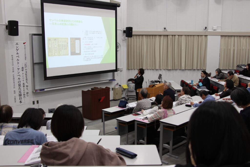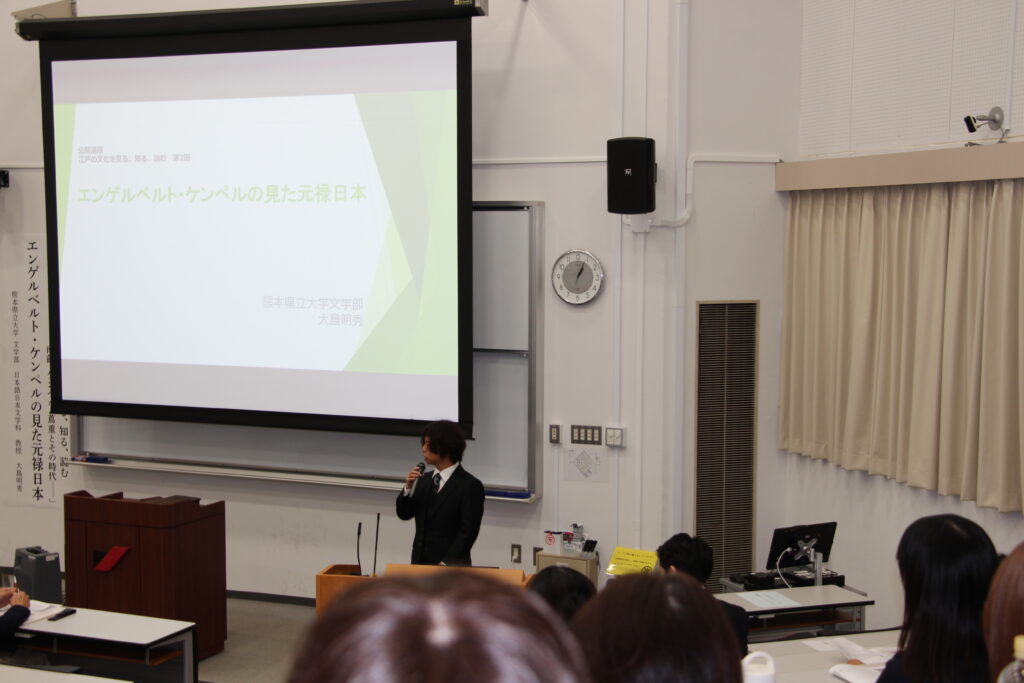 講師は本学文学部の大島明秀教授。歴史学を専攻され(特に蘭学・蘭学史)、今回は、元禄3年(1690、芭蕉が『おくのほそ道』の旅に出た翌年)に日本に来訪したヨーロッパ人(=日本にとっての他者)の目に“江戸”はどう映ったのかという視点で、「エンゲルベルト・ケンペルの見た元禄日本」と題してお話しいただきました。