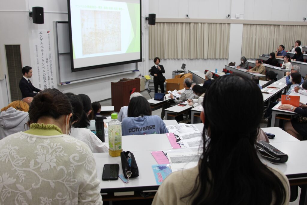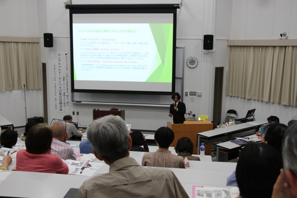 講演では、まず前提知識として、ケンペルが日本を訪れるまでの足跡を概観。バタフィア(現ジャカルタ)で医師としての勤務を希望するも叶わなかったため、日本に赴いたこと、滞在した各地で旺盛な知識欲を発揮し、文化・言語の記録に努めた様子などを確認されました。