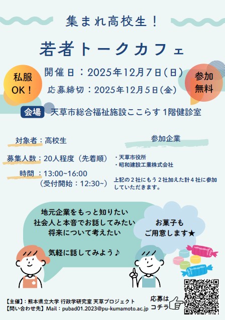 総合管理学部 行政学(公共政策)研究室では、地域連携型学生研究※の一環として、高校生を対象とした若手社員とのトークカフェイベント(座談会)を開催いたします。