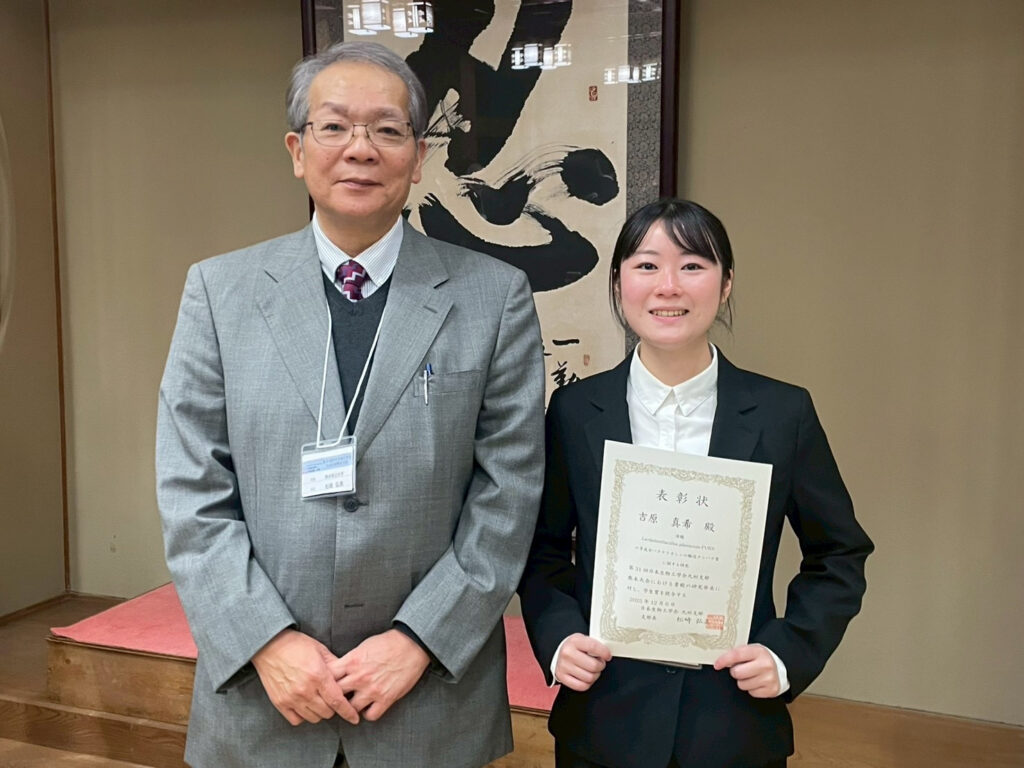 【受賞にあたってのコメント】 この度は、日本生物工学会九州支部熊本大会において、学生賞をいただき大変嬉しく思います。松崎教授をはじめ、日頃からご指導くださった先生方、共同研究者の方々、研究室の皆さんに感謝申し上げます。研究を通じ、多くの学びと成長の機会を得ることができたと思います。今後もさらなる研究の発展に貢献できるよう尽力します。(吉原真希)