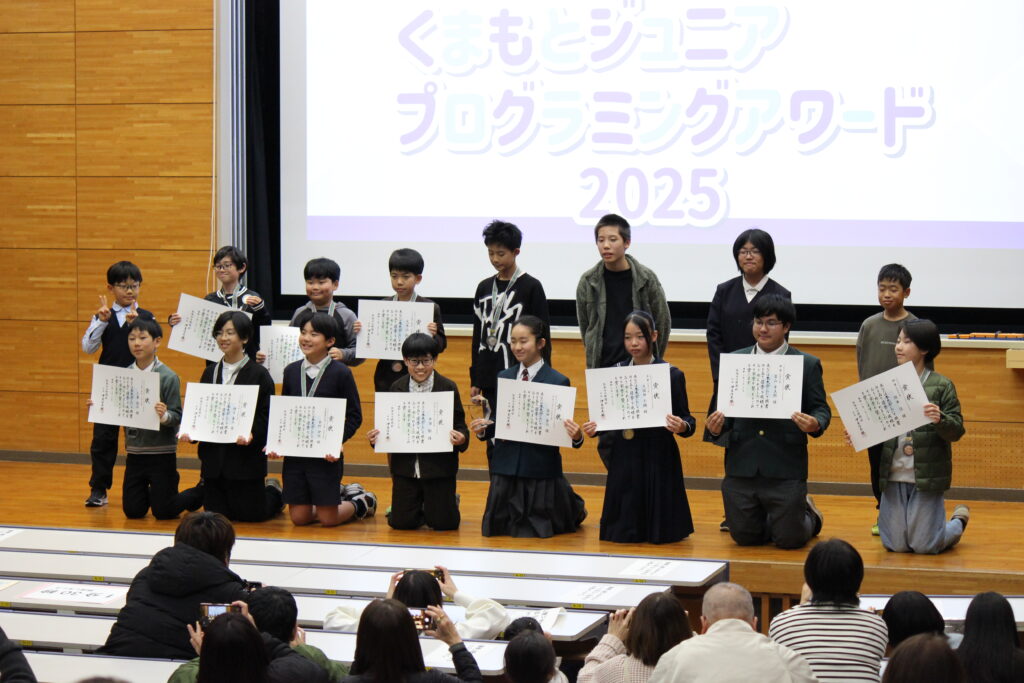 本イベントは熊本日日新聞社主催により、12月27日(土)に本学大ホールで実施されました。熊本県内の小中学生が社会課題などを解決するアイデアをもとに、様々なプログラミングを考え実現し、発表を行いました。