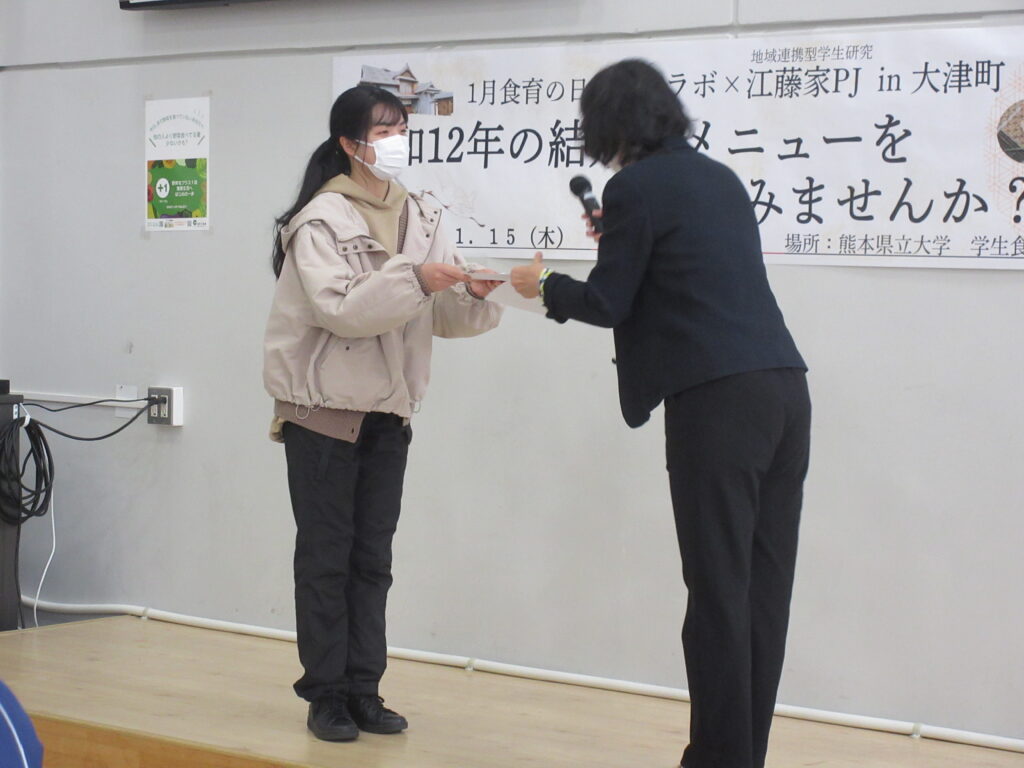 また、食育の日のステージ終了後には、たべラボ食育活動の表彰式を行いました。表彰式では、年間を通じて食育活動に積極的に参加した学生を対象に、表彰状の授与に加え、記念ワークショップへの参加特典が付与されました。さらに、表彰を受けた学生がたべラボの活動で印象に残っていることを発表し、今後の活動への意欲を共有する場ともなりました。