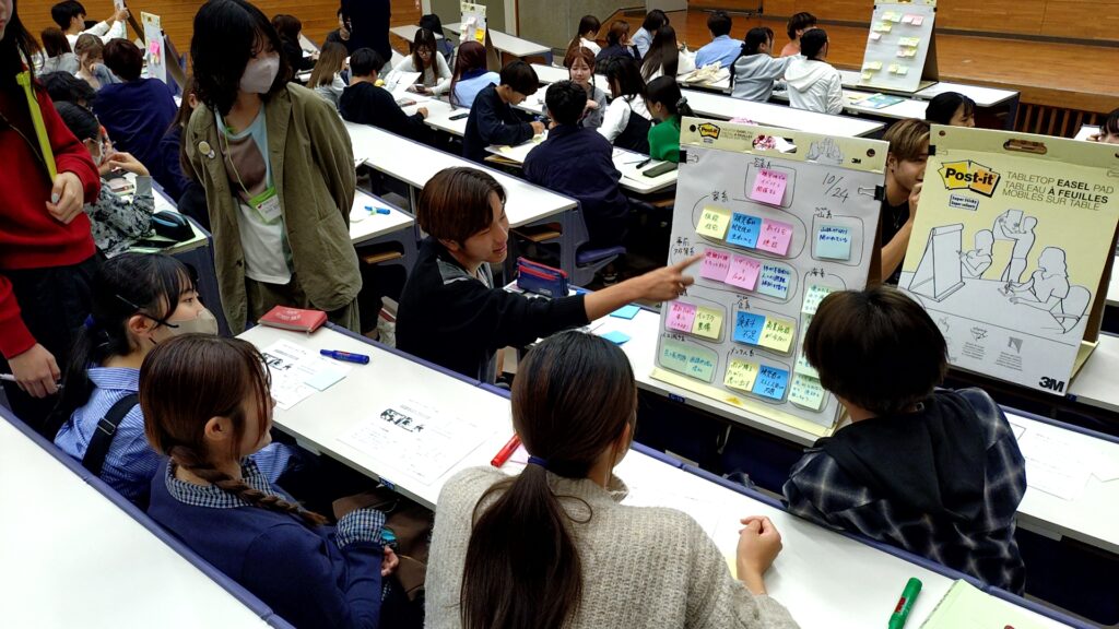 事前学習では、一般財団法人熊本県建設技術センター 常務理事 乙丸正彦さまより「熊本地震からの創造的な復旧・復興について」の講義を受けました。そして事前学習で学んだことを元に考えたことなどを付箋やイーゼルパッドにまとめ、グループワークを行いました。