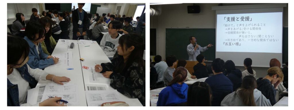 くまもとクロスロード研究会のご協力のもと、クロスロードゲームを実施しました。クロスロードゲームは、災害対応をテーマにしたカードゲームです。参加者は地震や水害、避難所設営といった災害時に遭遇する様々な状況の設問に対し、YESかNOかで自分の考えを示し、その理由を他の参加者と議論します。クロスロードゲームには絶対的な正解はなく、参加者はそれぞれの価値観や経験に基づいて判断し、その理由を説明し、また他の参加者の意見を聞くことで、多様な視点から災害対応について考えることが出来ます。