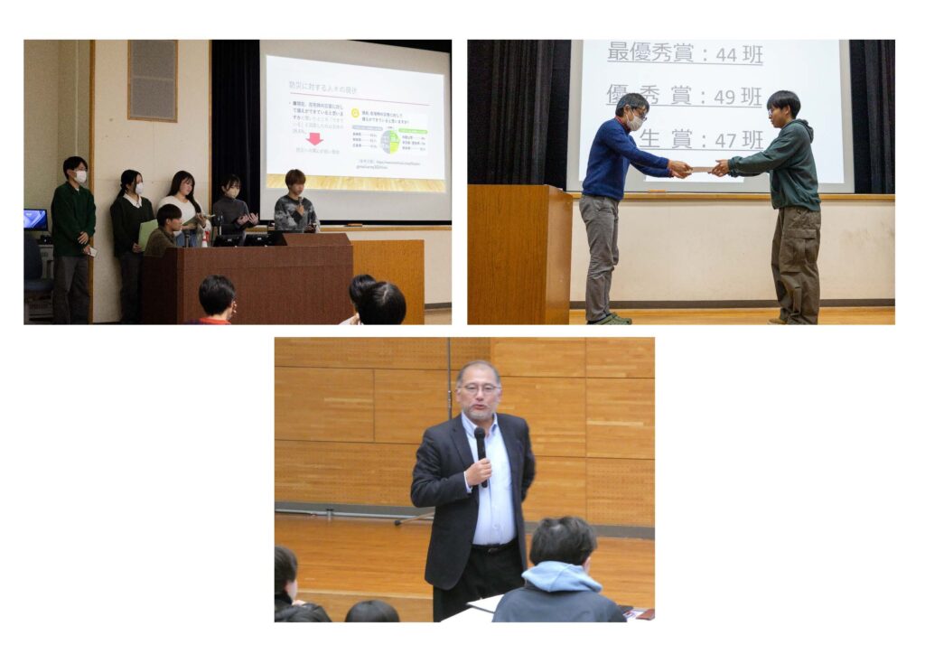 表彰式では学生の評価から選ばれる「学生賞」と、教員の評価から選ばれる「優秀賞」及び「最優秀賞」を選出し、各教室の担当教員より賞状が授与されました。