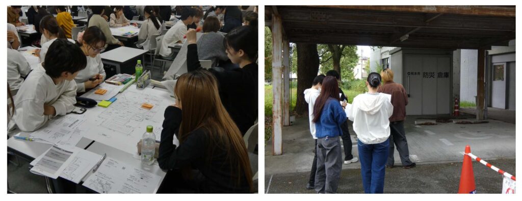 担当教員の柴田教授指導のもと、災害図上訓練(DIG:Disaster Imagination Game)を実施しました。DIGは地図を使って災害を疑似体験し、参加者が主体的に防災対策を検討する訓練になります。今回は熊本県立大学の構内地図を使用して実施しました。危ない箇所や荷物が搬入しやすい場所などを検討しながら学内を散策し、地図に書き込みを行っています。