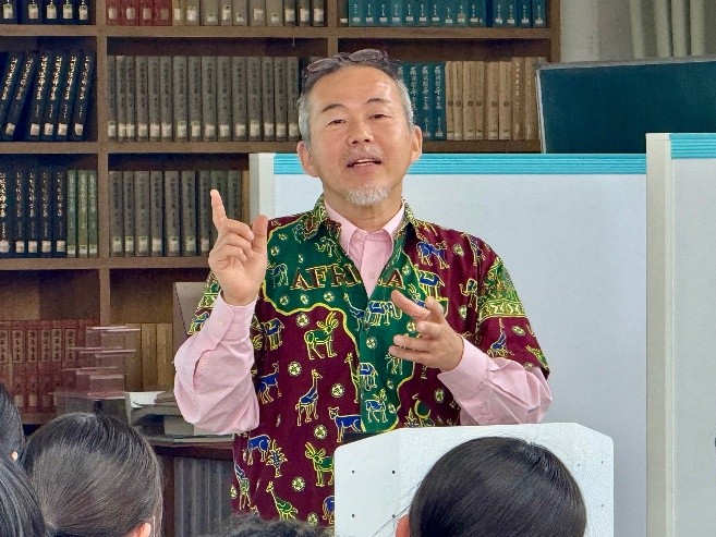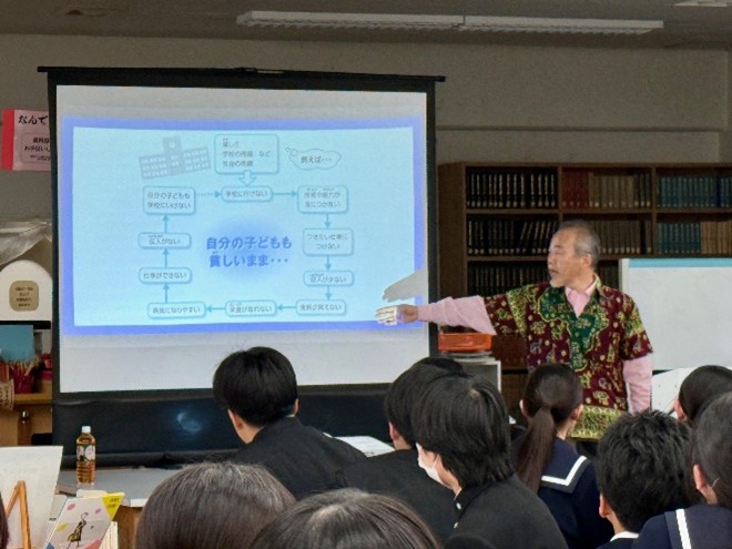 世界の途上国を知る一例として、遠藤特任教授がこれまで滞在したアフリカ・モザンビークの現状を紹介。「途上国では貧しい家庭に生まれると、その子どもも貧困から抜け出すことが難しい。一方、日本には努力次第で状況を変える機会がある」と述べ、国際協力の必要性について生徒に問いかけました。
