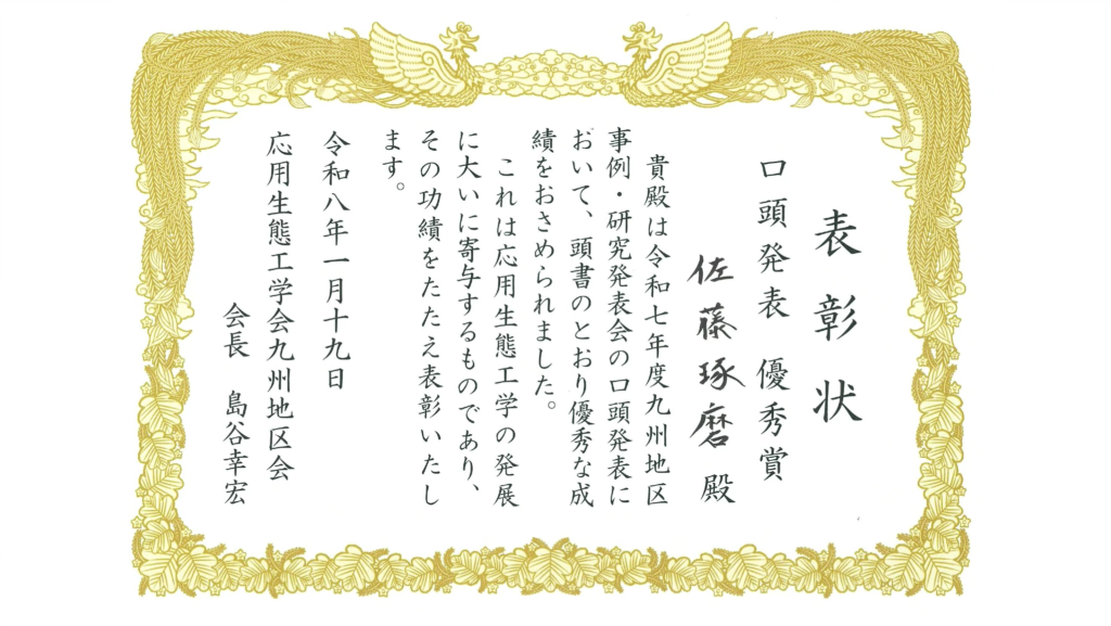この度は、応用生態工学会九州地区会において、口頭発表優秀賞をいただき大変嬉しく思います。飯村教授をはじめ、共同研究者の方々、研究室の皆さん、また研究に協力くださった熊本県菊池市藤田地区の住民に深く感謝申し上げます。これからも防災分野だけに留まらず、集落の困りごとを解決する糸口となる研究を進めて、熊本県から全国に広がるような研究ができるよう邁進して参ります。(佐藤琢磨)