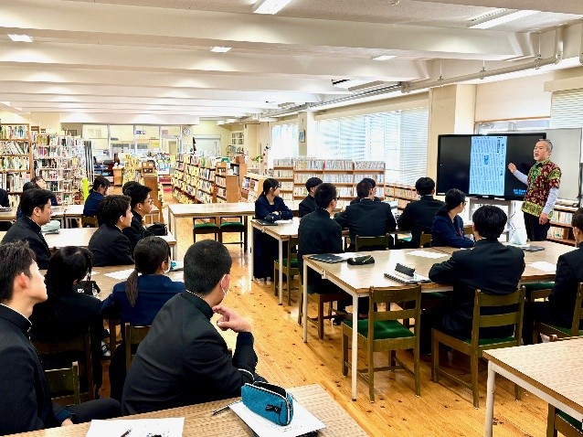 本学では、高大連携事業の一環として「サステナビリティ講座」を実施しています。2月3日には、本学特任教授の遠藤浩昭を講師に、熊本県立鹿本高校みらい創造科グローバル探究コース2年生28名を対象に講座を行いました。当日は、サステナビリティ(持続可能性)の視点から、熊本が抱える地域課題と海外の事例を比較しながら、地域と世界について理解を深めました。