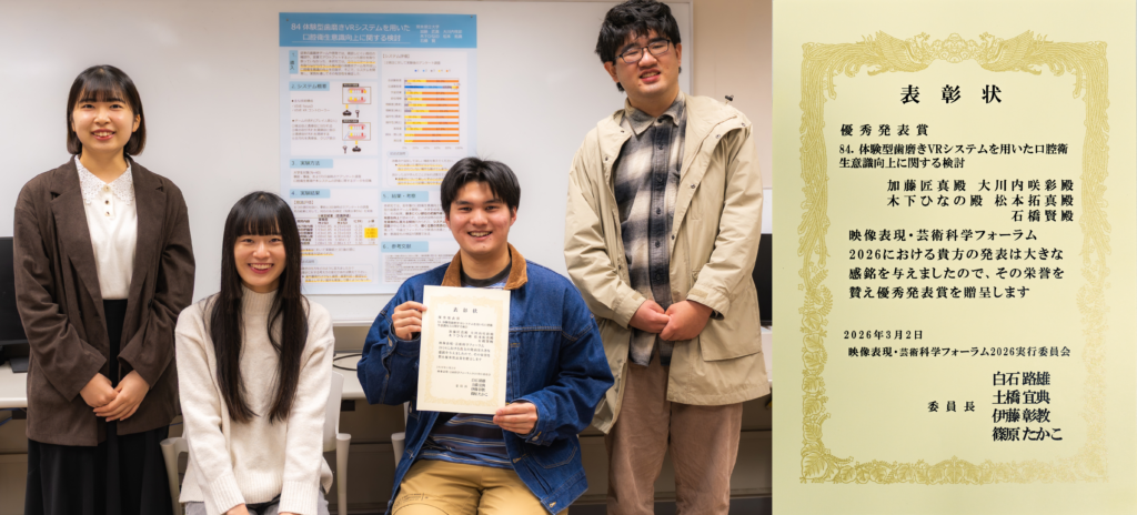 この度、映像表現・芸術科学フォーラム2026において、ポスター発表の部で優秀発表賞をいただくことができました。 研究内容といたしましては、VRで行う二人協力型の歯磨きゲームを制作し、口腔衛生の意識向上を目指しました。 石橋教授をはじめ、研究に協力してくださった皆様に深く感謝申し上げます。 様々な苦労がありましたが、このような形で表彰されて、大変嬉しく思います。