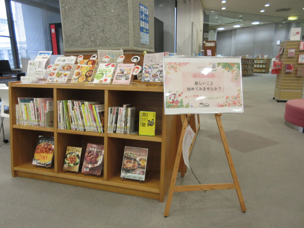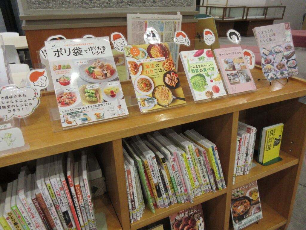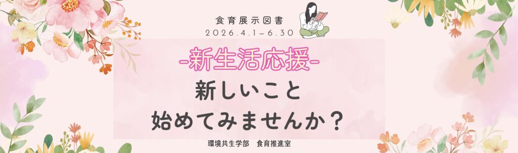 食育推進室では、3カ月ごとにテーマを設定し、学生生活に役立つ図書の展示を行っています。