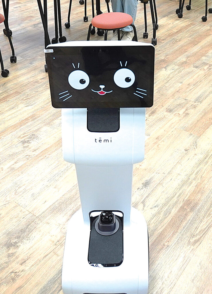 お客さんが来た時に、「ようこそ県大へ」みたいな使い方をしてます。昔あったペッパー君のようなものです。ナビゲーションする時に、「落ち着いて付いて来てください」という音声を流しながら案内します。国際交流の催しでは多言語化を活用し、学校案内の補助を行いました。
