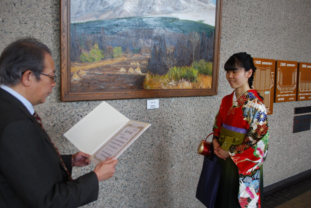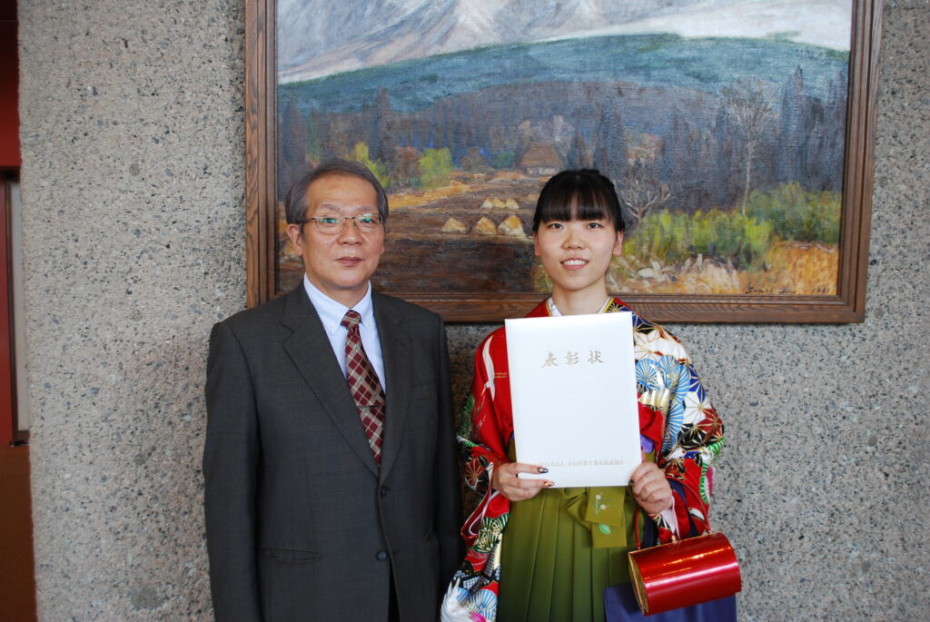 今年度は、環境共生学部環境共生学科食健康環境学専攻4年の伊藤優里さんが本学からの推薦により選ばれ、令和8年(2026年)3月21日(土)に松﨑弘美食健康環境学専攻長から表彰状が授与されました。