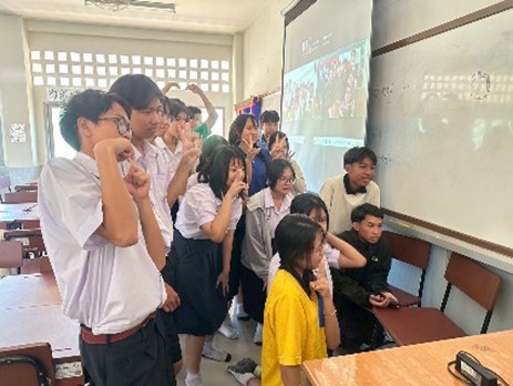 高校1年生の最後のクラスは、日本の高校生とのオンライン交流会でした。内容は、日本の生徒から日本文化に関する発表を聞き、それに対してタイの生徒が質問するというもの。カメラが繋がってお互いの姿が見えると、歓声と拍手が沸き上がりました。