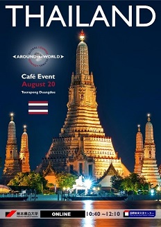 令和3年(2021年)8月20日(金)、第9回Global LoungeカフェイベントAround the World「タイ」を、英語短期集中プログラム「Intensive English」の一環として開催しました。このイベントは、新型コロナウイルス感染症まん延防止等重点措置期間中であったことから会場への入場者数が制限されたため、より多くの方に参加していただけるようZoomでのライブ配信も同時に行いました。