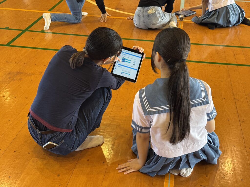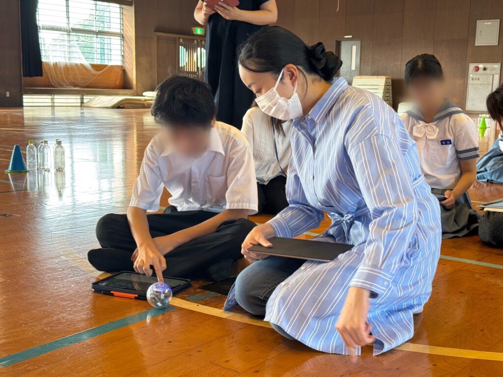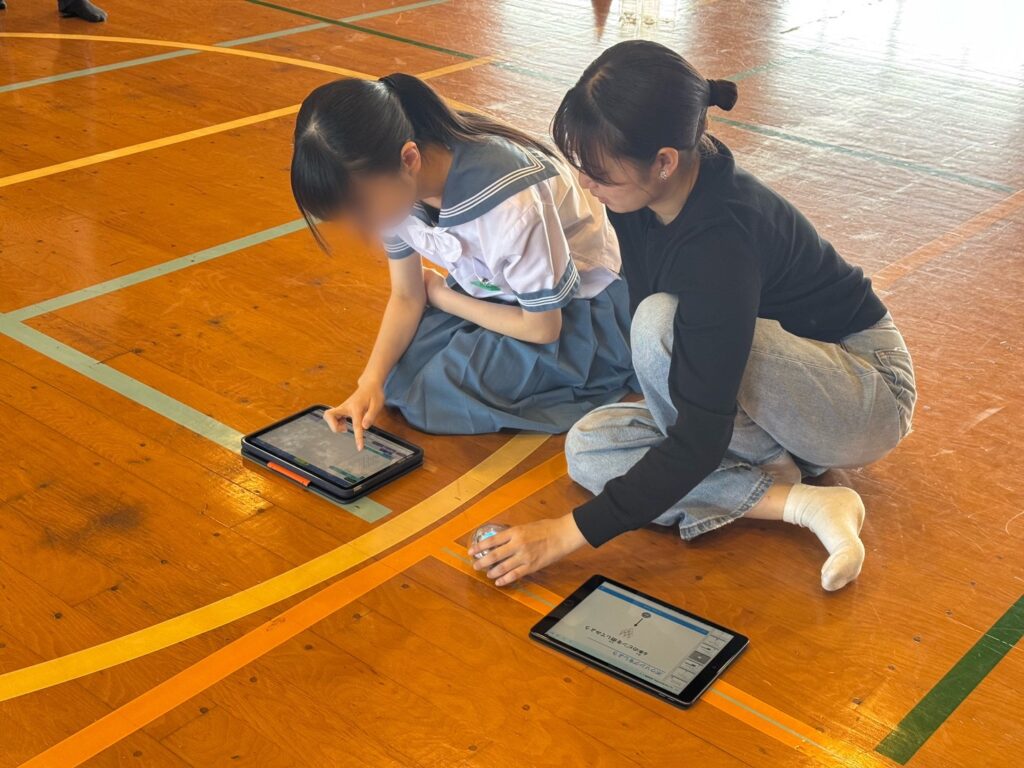 今回のアウトリーチ活動では、球体ロボットSphero(スフィロ)を使用し、プログラミングで動きを指示してボウリングに挑戦する授業を行いました。まず、生徒たちはタブレットを使って Sphero の操作を体験しました。Sphero は、角度やスピード、時間を自分で設定して動きを指示できるロボットで、自分のプログラムがそのまま目の前の動きに反映されます。プログラムが完成した後は、体育館に並べたペットボトルのピンに向かって実際にボウリングを実施しました。生徒たちは「思った通りに動いた!」「もっと角度を変えてみたい!」といった声を上げながら、意欲的かつ楽しそうに取り組んでいました。また、思い通りに進まず悔しがる姿や、ピンを倒して喜ぶ姿が見られ、会場全体が明るく活気に満ちた雰囲気となりました。今回の活動を通して、生徒たちは試行錯誤しながら物事に取り組むことの大切さを学ぶことができたと感じています。